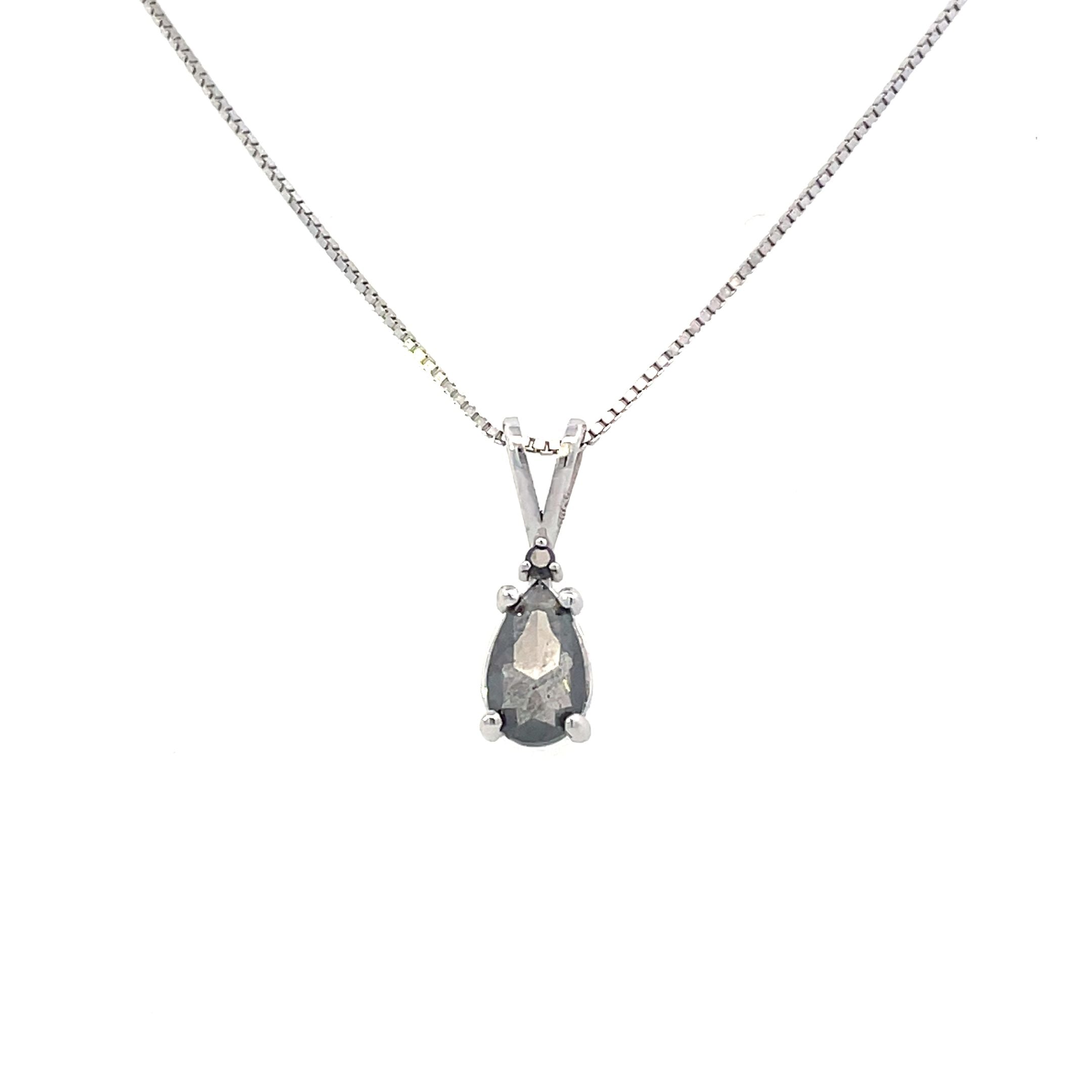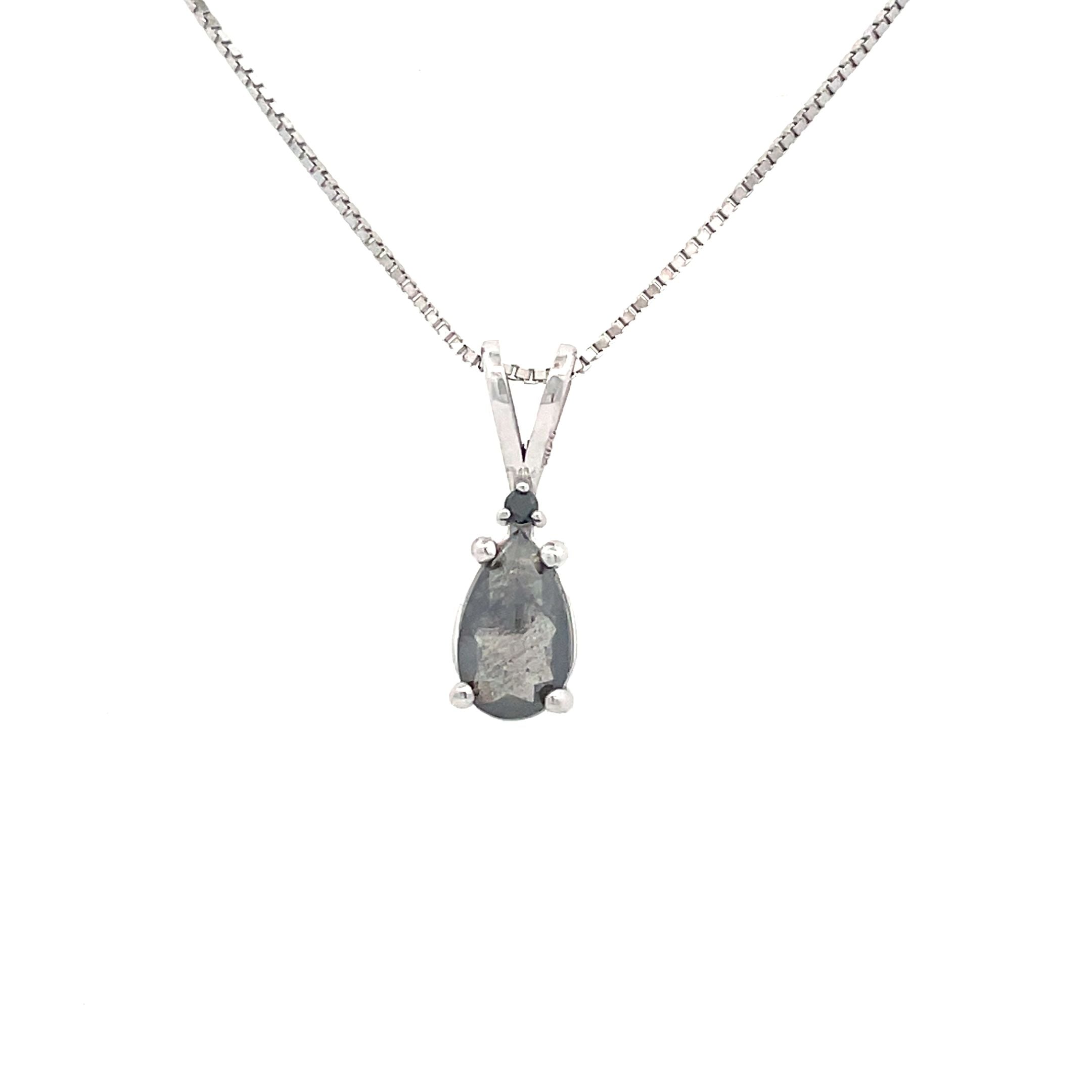 Discover the unique beauty of our Pear-Shaped Salt & Pepper Diamond Pendant. Featuring a stunning 1.02ct pear shaped salt & pepper diamond with a delicate .02pt black diamond accent. This pendant is crafted with 14K white gold and comes on an 18" box chain. Perfect for adding a touch of elegance to any outfit.