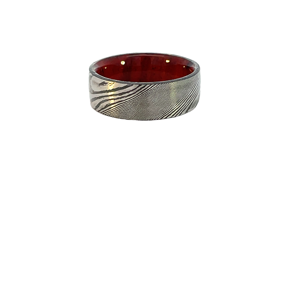 Crafted with precision, this stunning Damascus ring showcases an exquisite wood grain and cocobolo wood design that captures the light beautifully. Ideal for both everyday wear and special events.