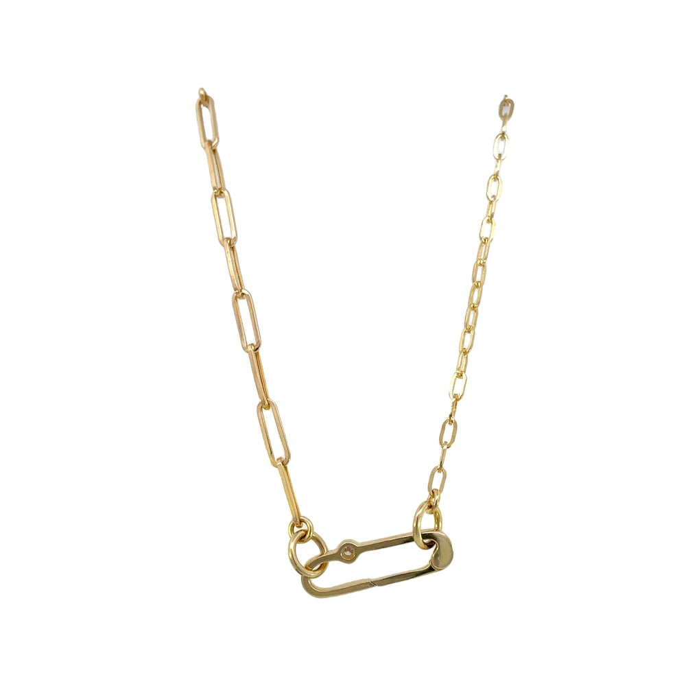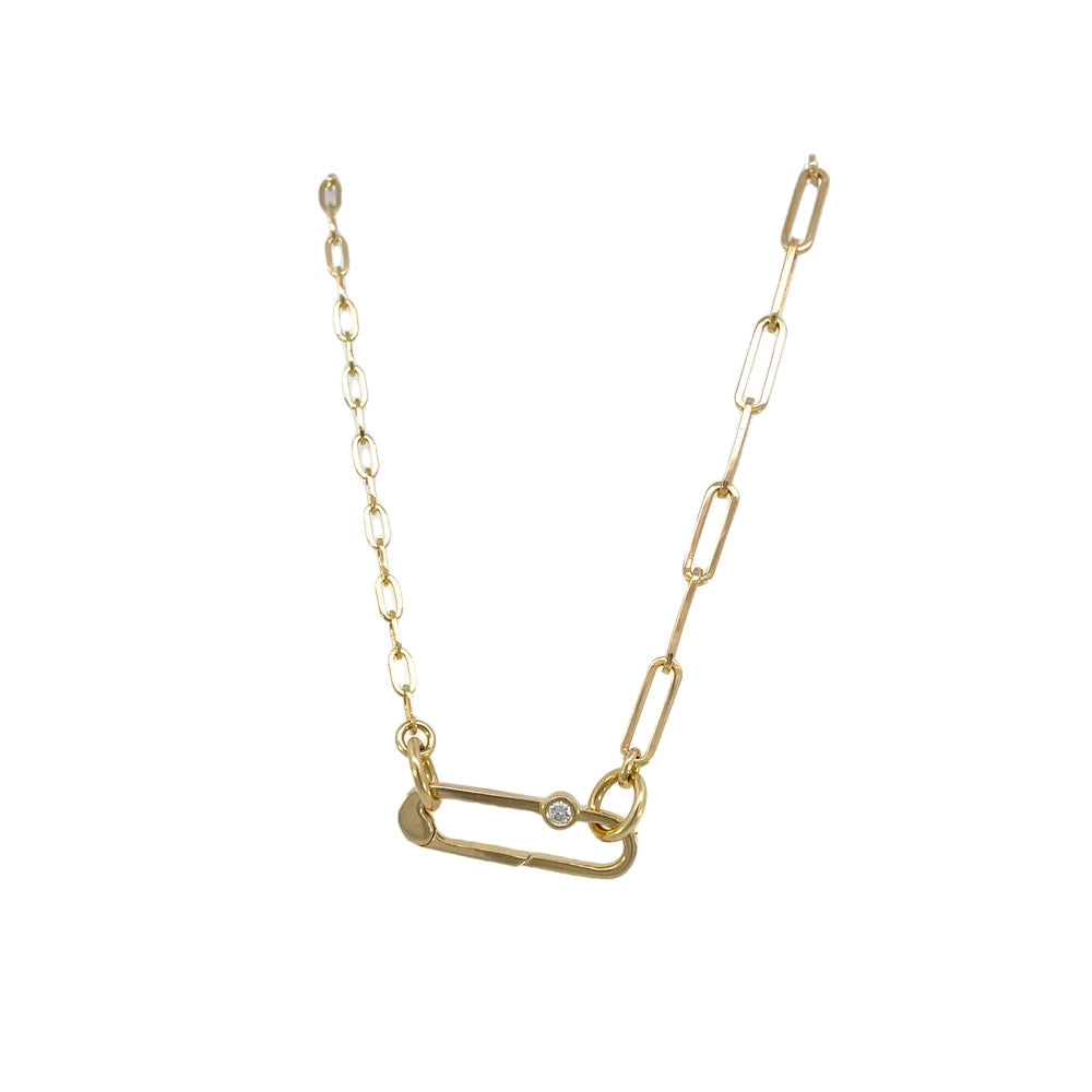 A stunning 14k yellow gold chain necklace that combines classic elegance with modern flair. The elongated links create a sleek look, while the distinctive clasp adds an element of intrigue. The clip clasp is set with 1/20tw white diamond