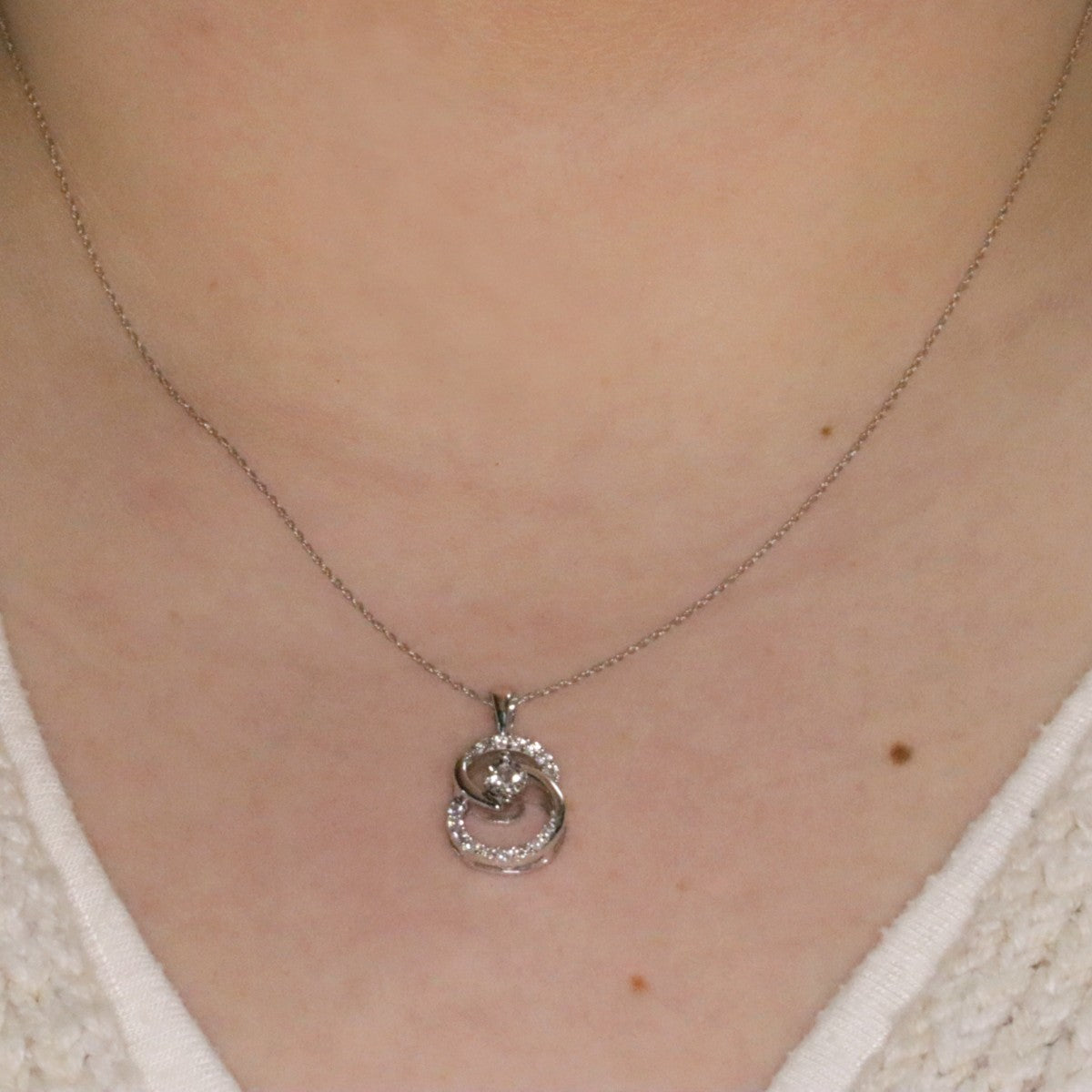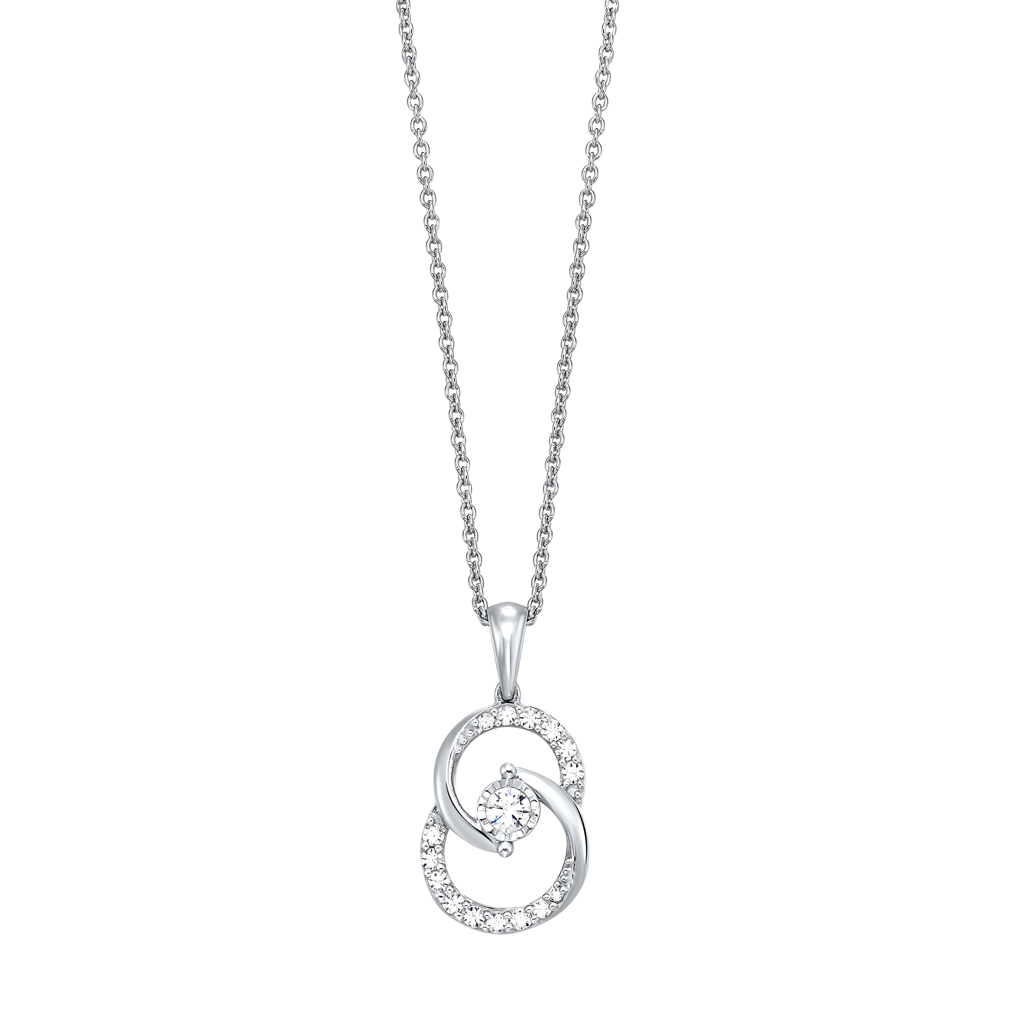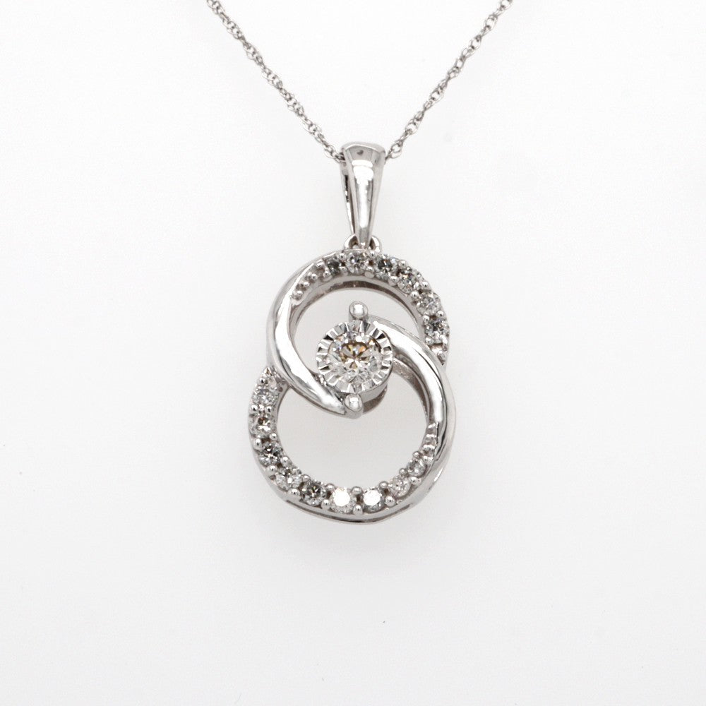 Symbolize your love with this gorgeous white gold and diamond pendant. Featuring two interlocking circles set with 1/4 carat total weight of diamonds. 10 karat white gold with an 18 inch chain.