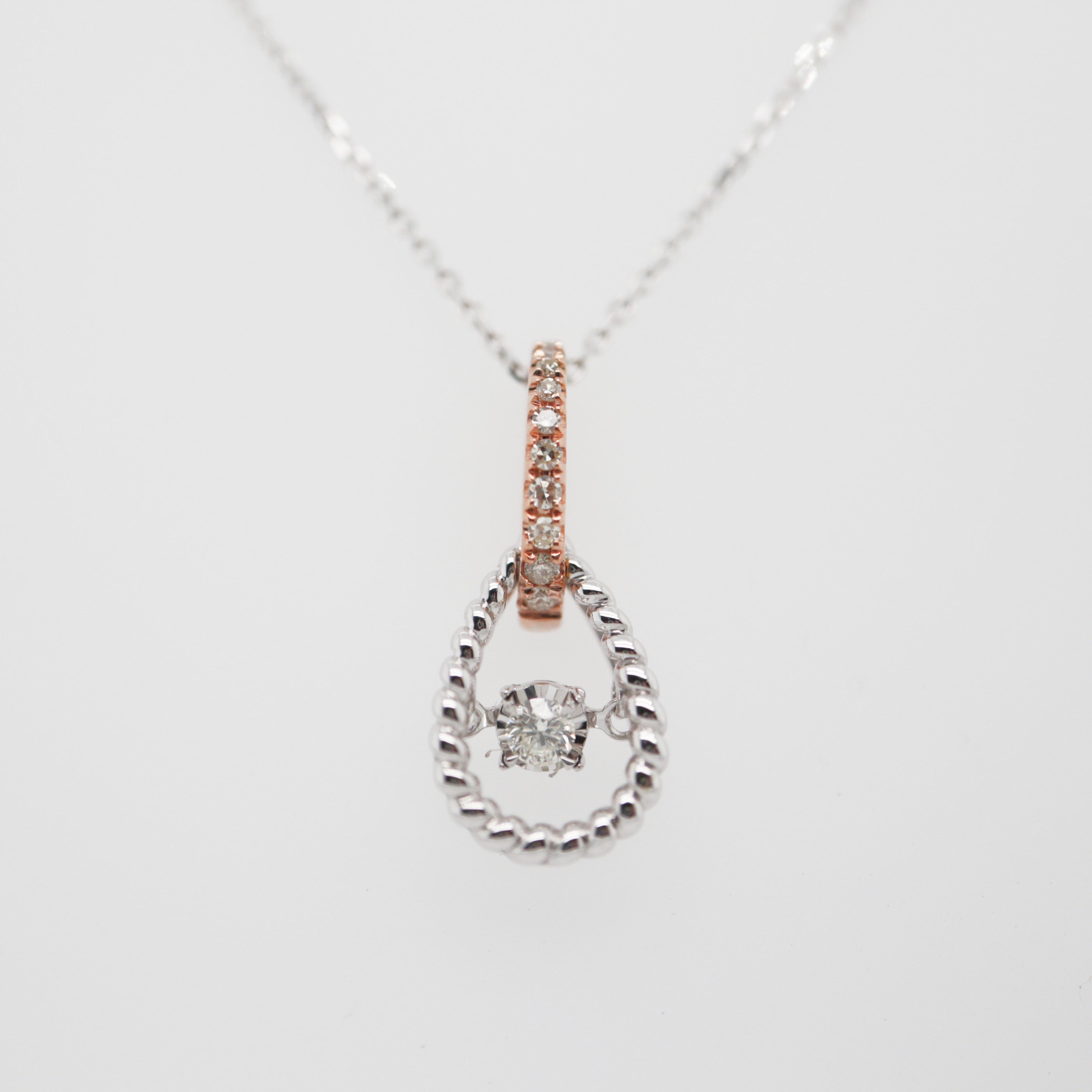 Set in 10K White and Rose gold with 1/8th Carat Total Weight of genuine diamonds. 18 inch chain.