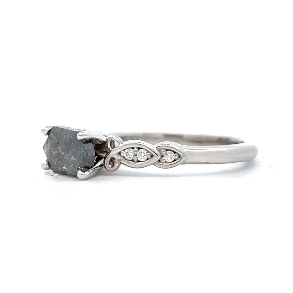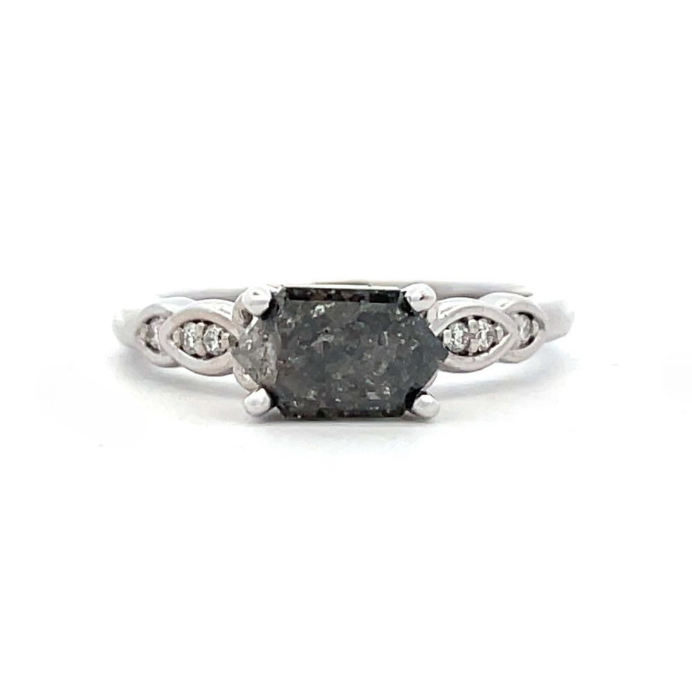 This stunning ring features a salt and pepper center diamond with accent diamonds on either side. This breathtaking ring would make a perfect engagement or fashion ring.