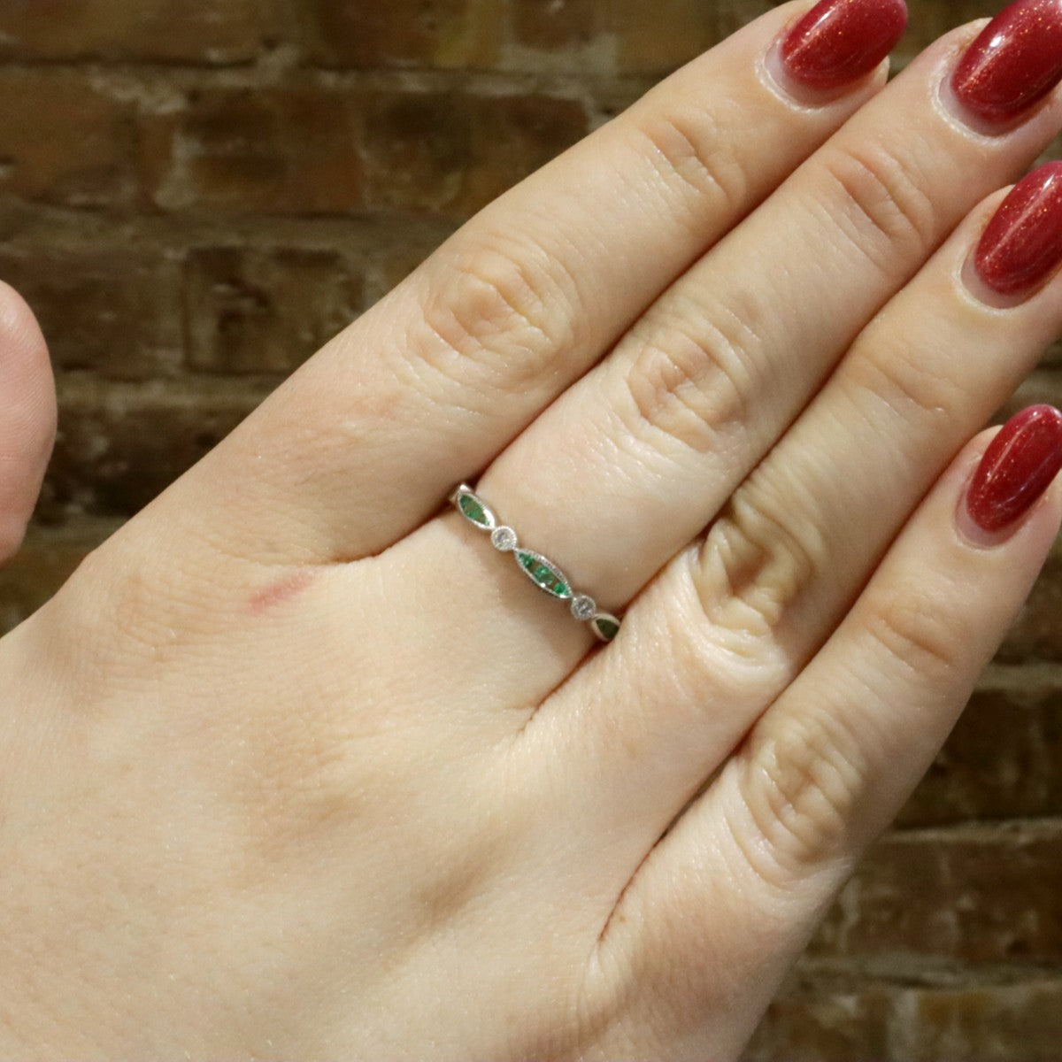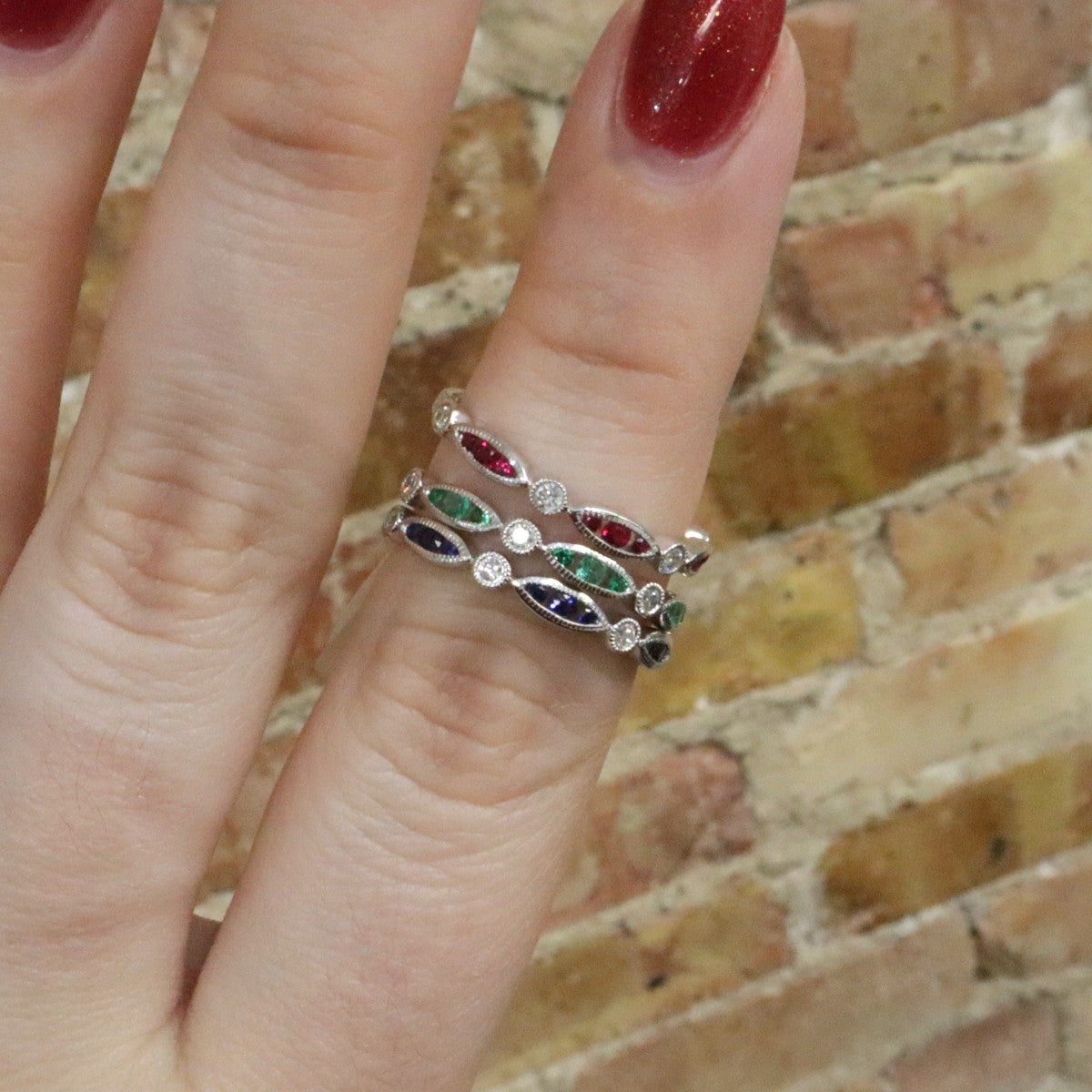 When purchasing stackable rings, ensure that they play nicely together by coordinating the metal types, jewel colors, and overall shape of the rings. Your dazzling statement or engagement ring might be perfectly accentuated by a stacked ring of the same metal type on the same finger, or with an array of the same jewels. Not sure which ring arrangement is best for your style? Our attentive, experienced staff is devoted to making sure that your stack is harmonized to your personal taste and aesthetic.