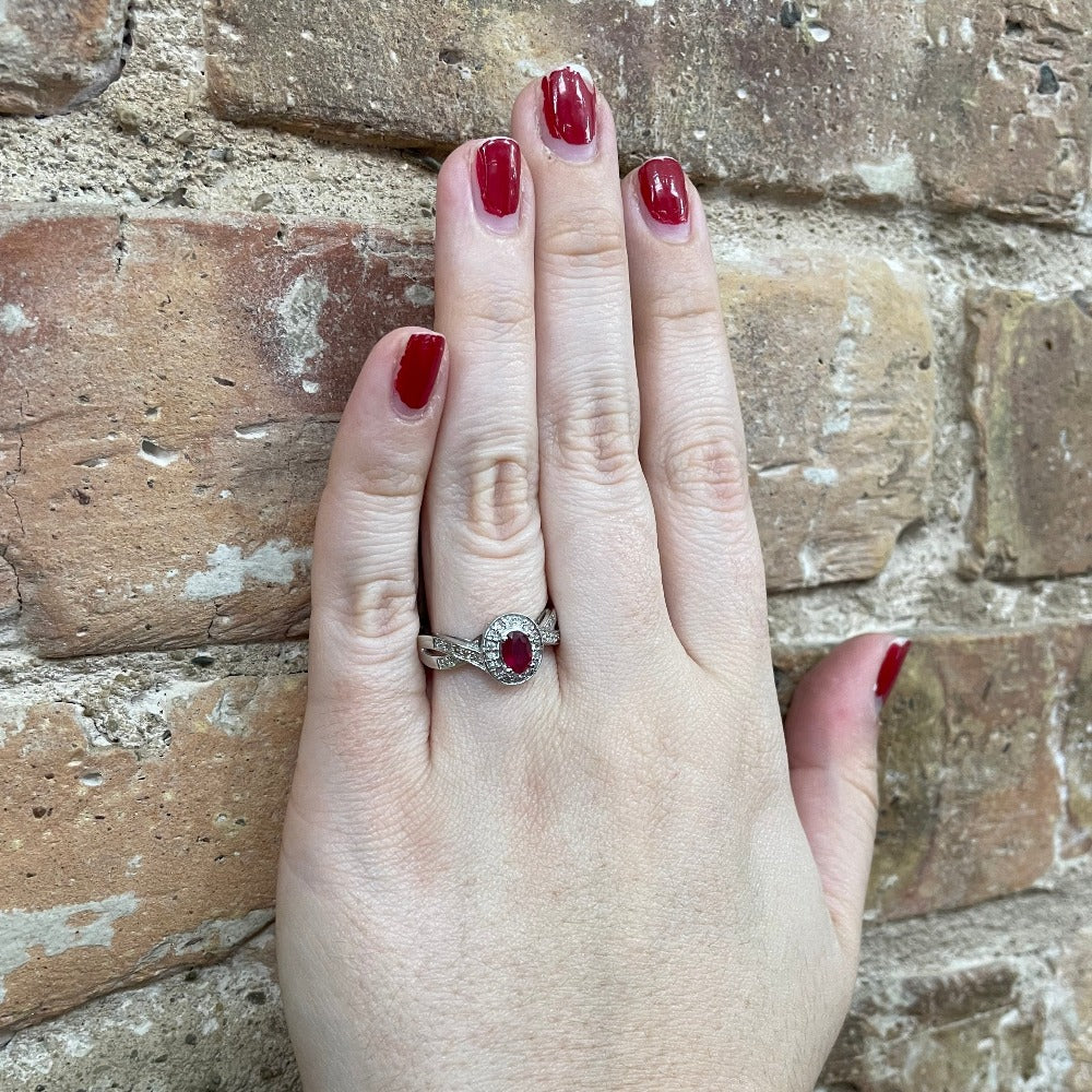 This stunning ring feature an oval ruby with a round diamond halo and a diamond accented shank. A truly enchanting ring for anyone looking to add a bit of color to their daily wardrobe or a special someone with a July birthday.