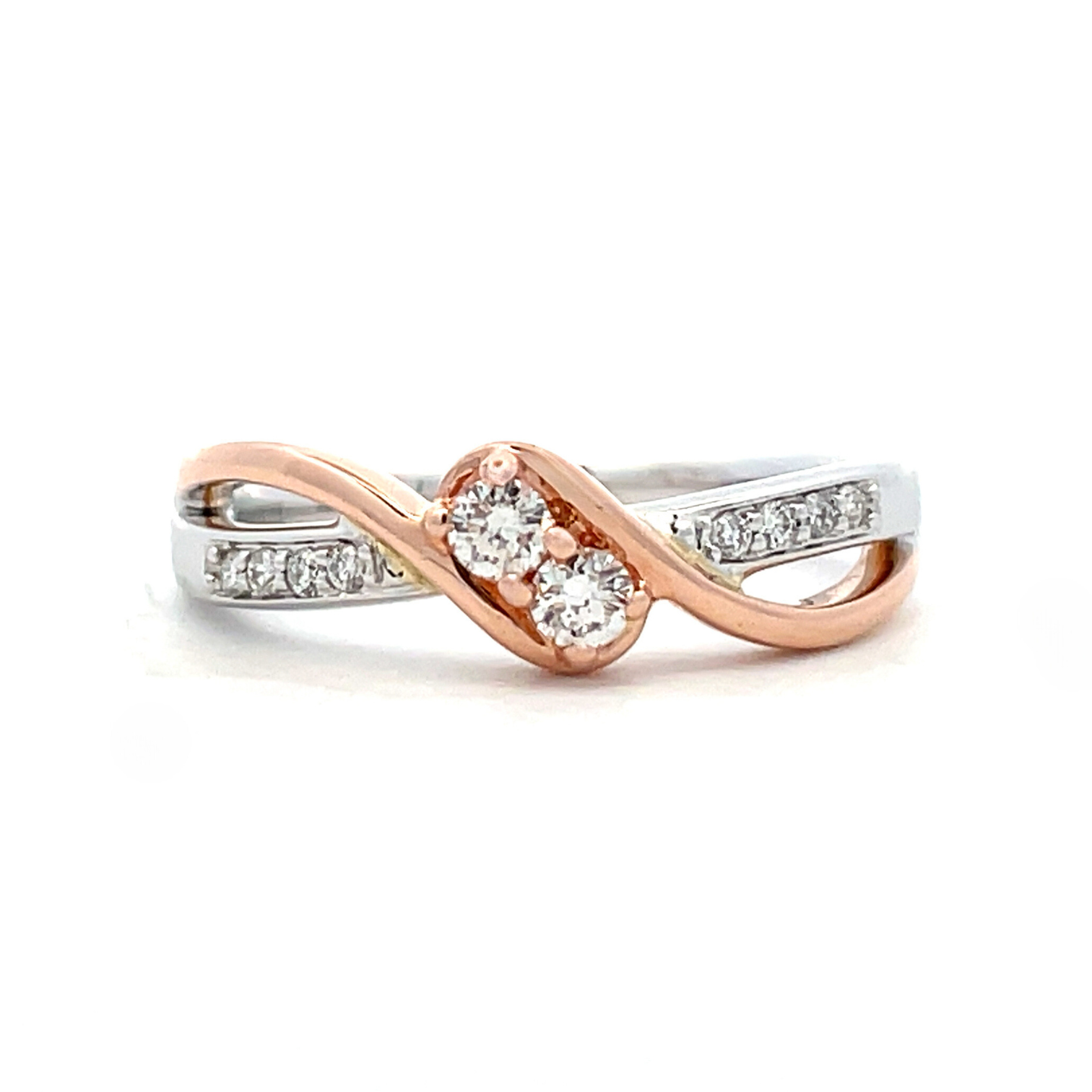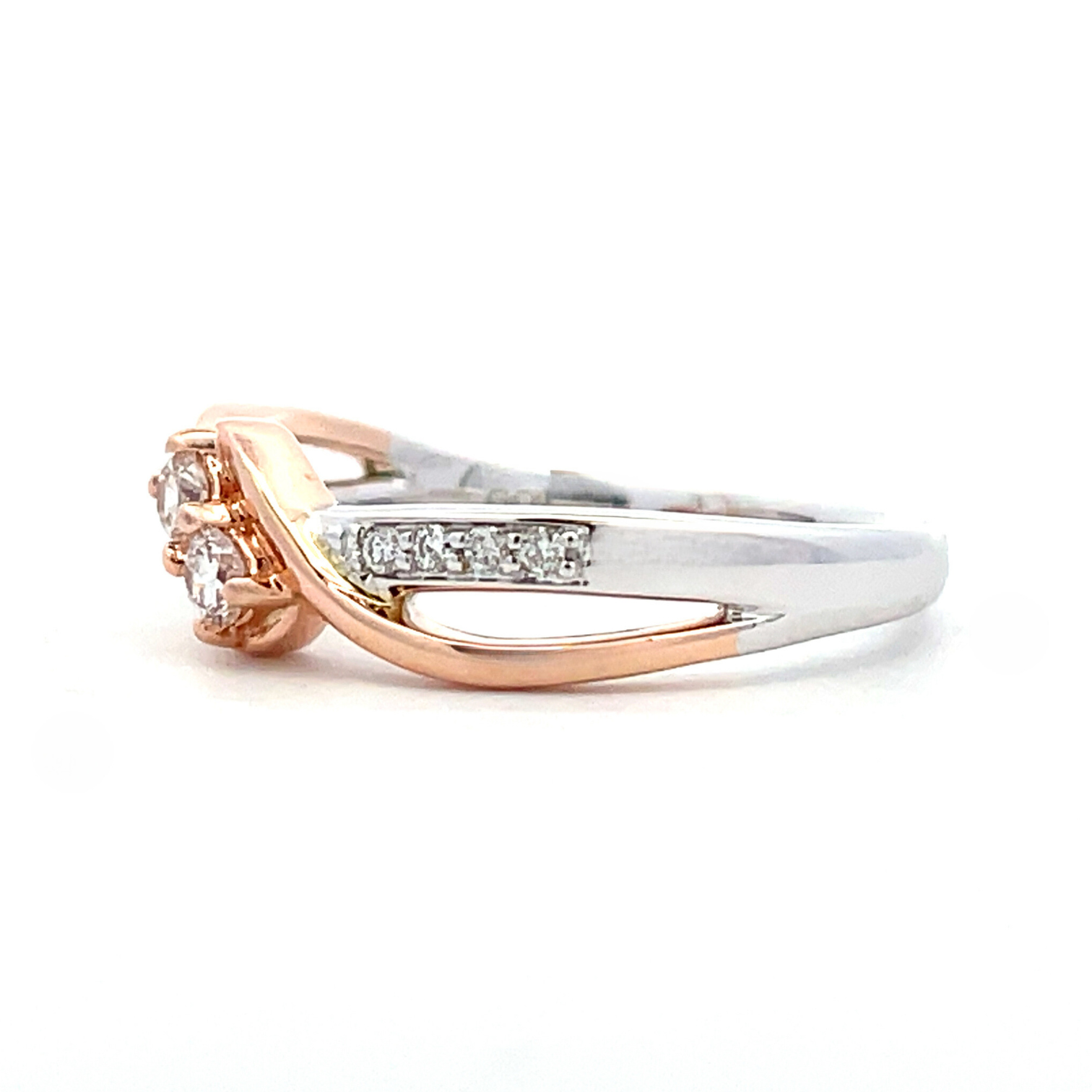 This stunning 14K rose and white gold engagement ring features 2 beautiful diamonds as its centerpiece and channel set diamond accents. This TwoGether ring is designed to signify togetherness and is a beautiful way to demonstrate your love to that special someone and tell the story of your relationship.