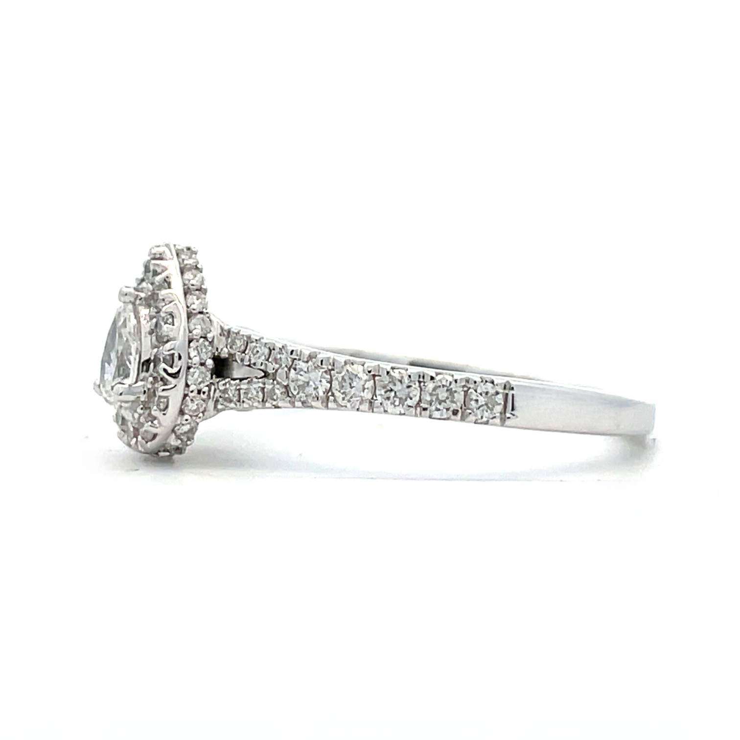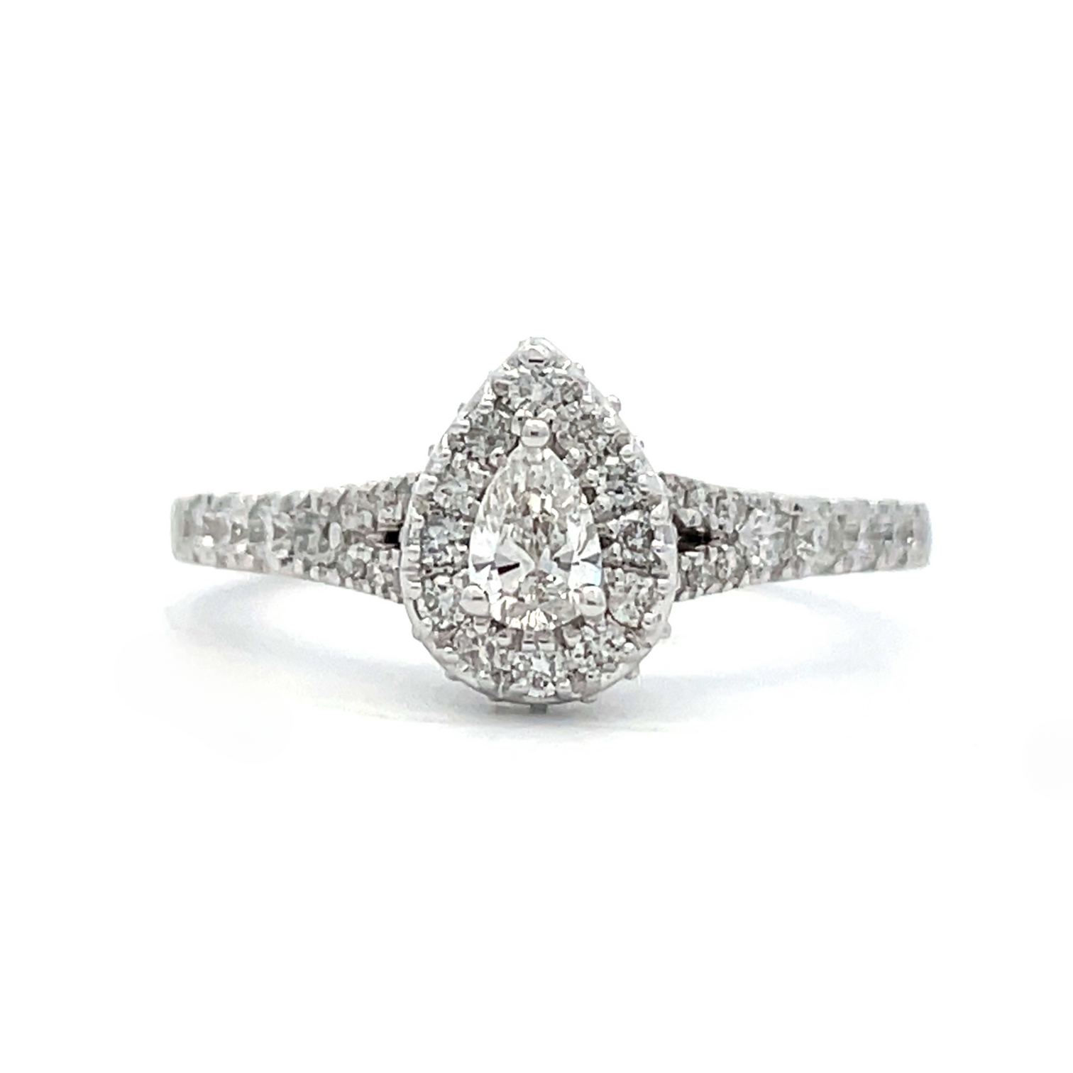 This beautiful diamond engagement ring features a pear shaped diamond center with a stunning halo of round diamonds set in 14K white gold. The shank sports a diamond accented split design and is a breathtaking sparkling ring. This is sure to leave a smile on her face.