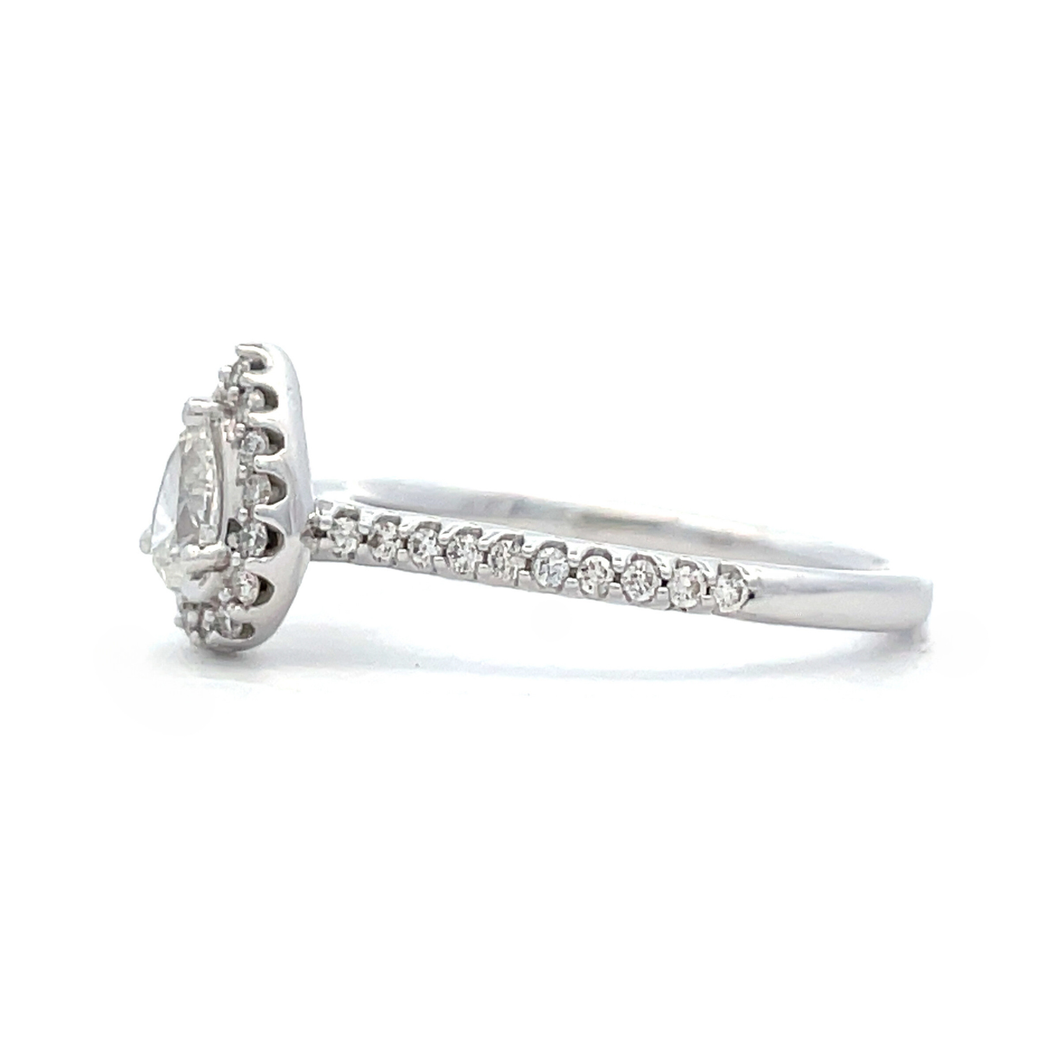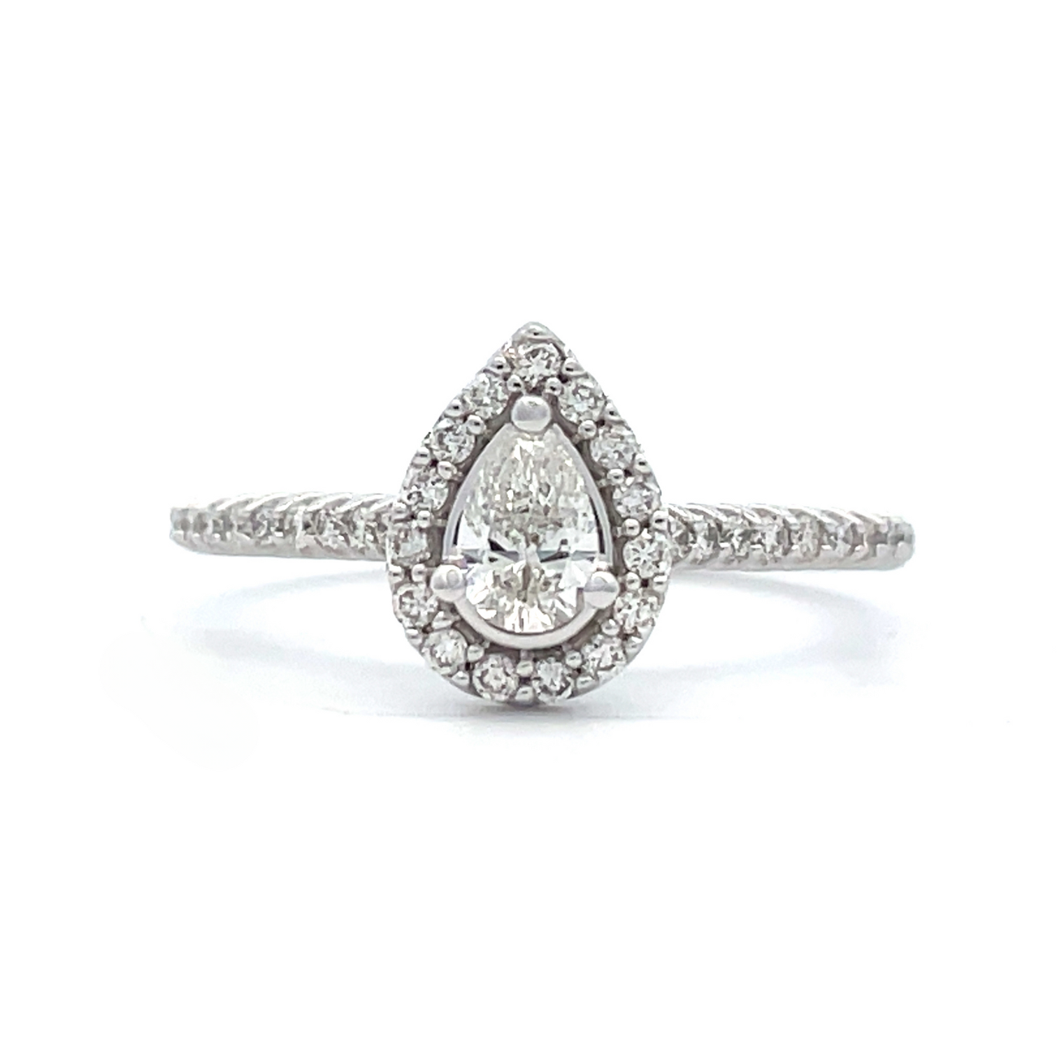 This elegant ring features a 1/4 carat pear shaped diamond center with a stunning halo or round diamonds and accents down each side (1/4CTW) in a 14K white gold setting. A beautiful way to show your love to that special someone and is sure to bring a smile for years to come.