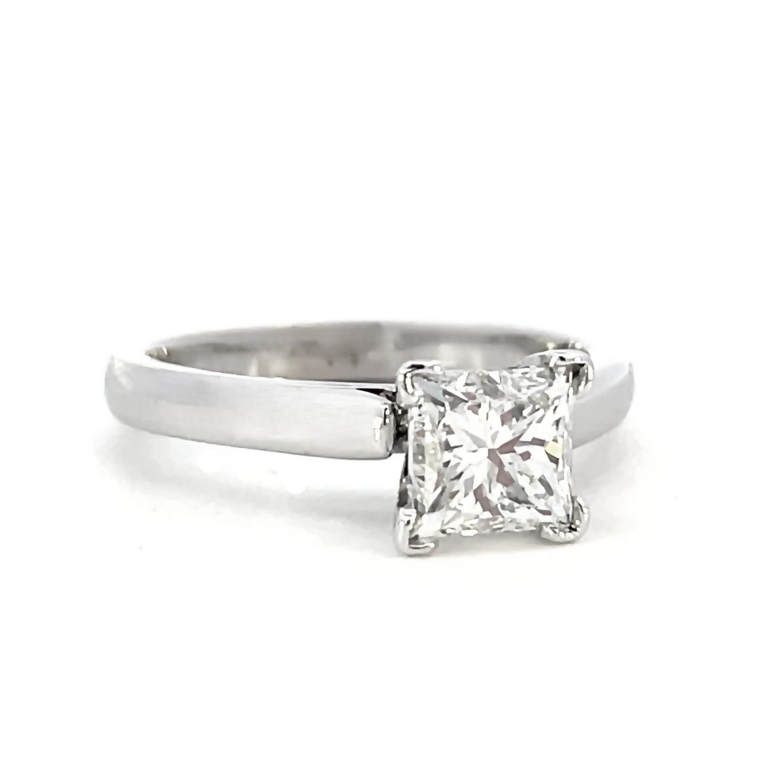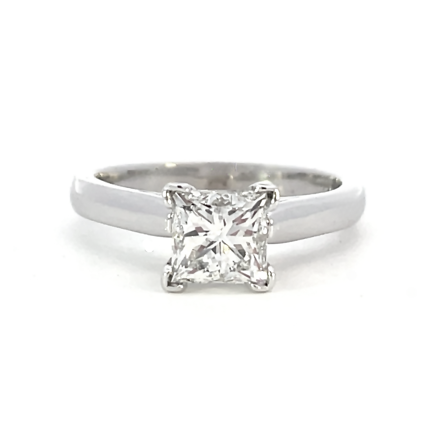 This beautiful princess cut engagement ring features a breathtaking 1.56 carat center diamond in a stunning 14K white gold solitaire setting. This diamond needs no accents and is an incredible way to show that special someone how deep your love runs.