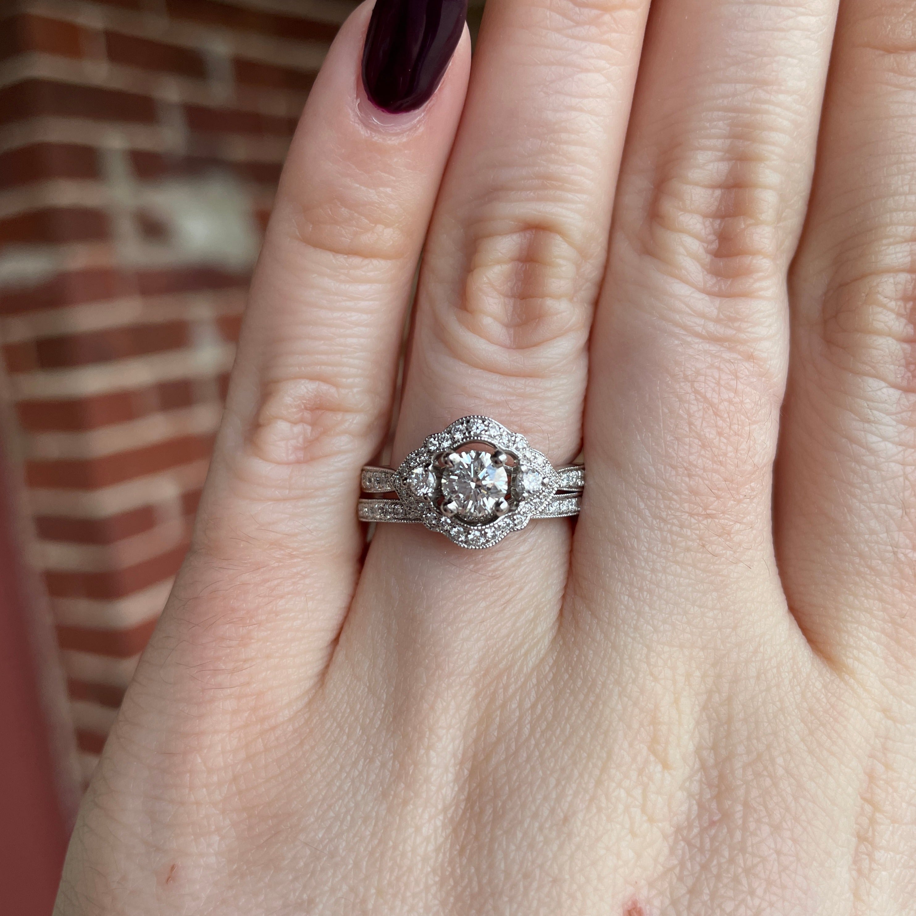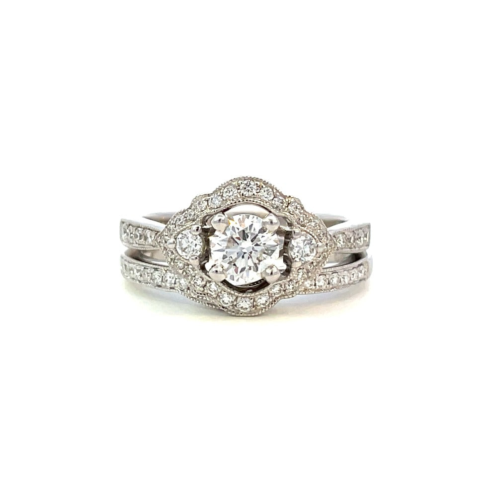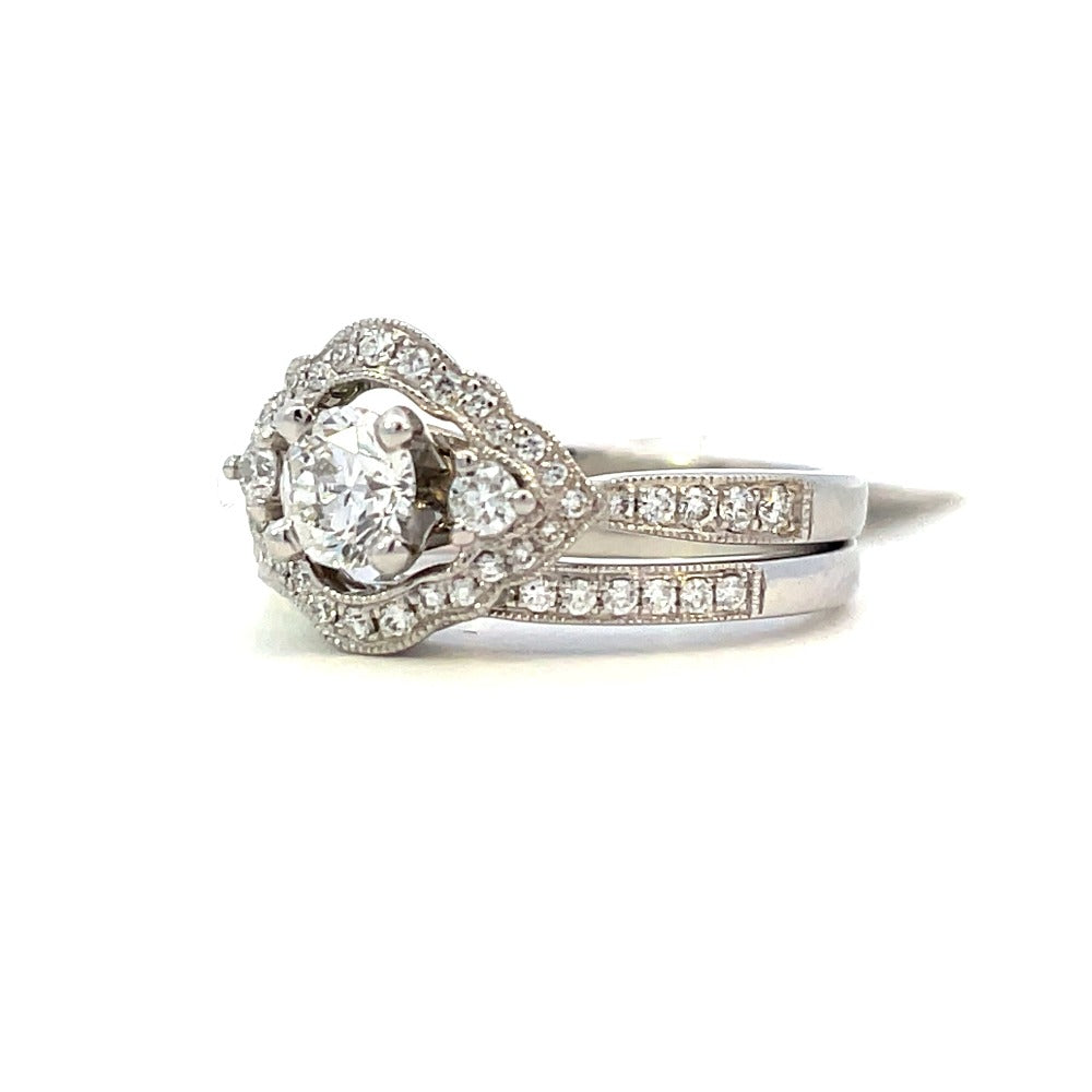 This 14K white gold three-stone wedding set features an antique-inspired halo and a contoured band with beaded edges. With a 1/2 carat center stone and a total weight of .96 carats, this ring set is the perfect blend of vintage charm and modern elegance.