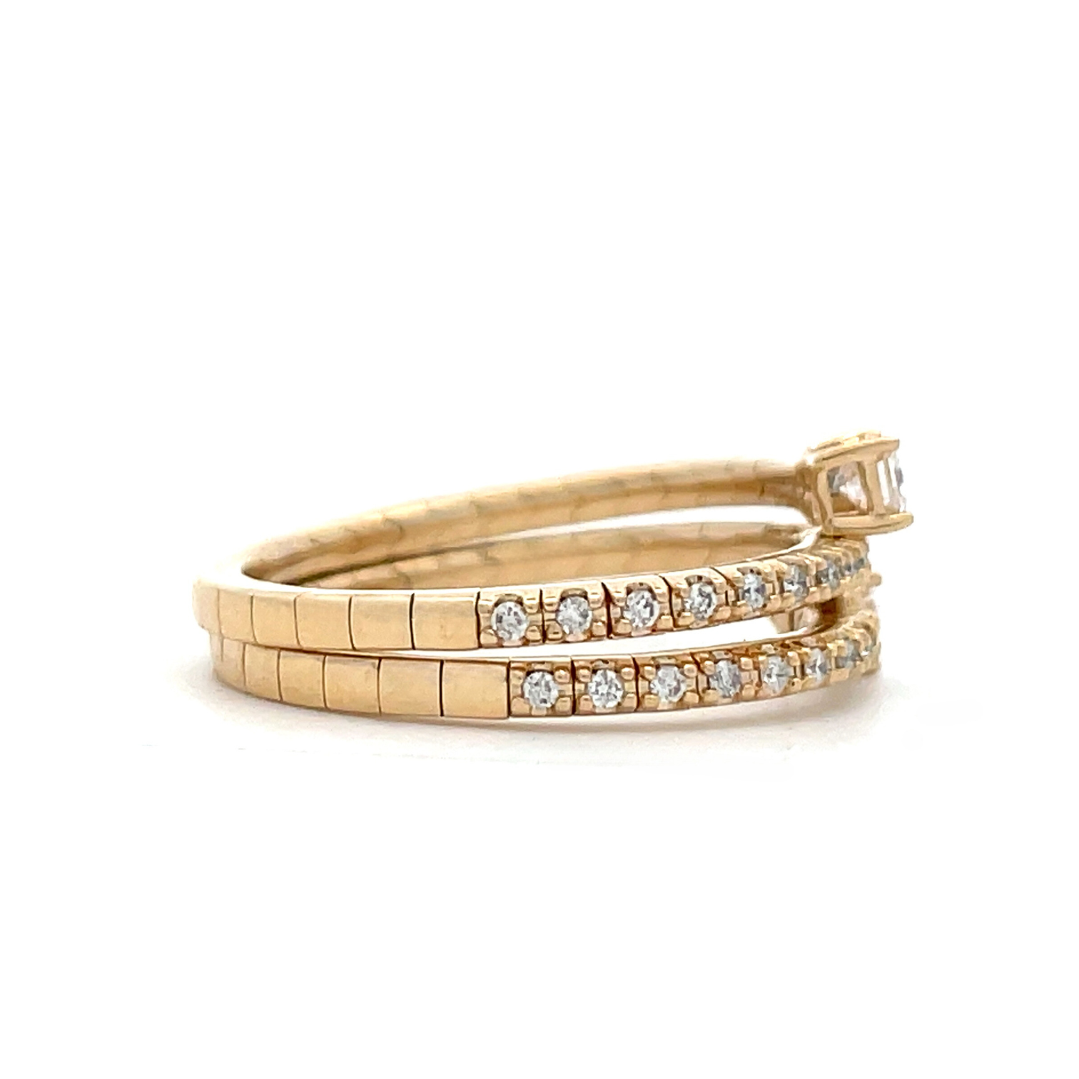 Experience luxury and glamour with our 14KY Three-Row Diamond Spring Ring. The 14K yellow gold ring features stunning emerald and pear cut accents, totaling 1/2 carat. Its flexible design makes it a perfect fit for finger sizes 5-8. Elevate any look with this elegant and versatile piece from Fernbaugh's Jewelers.
