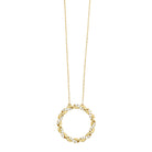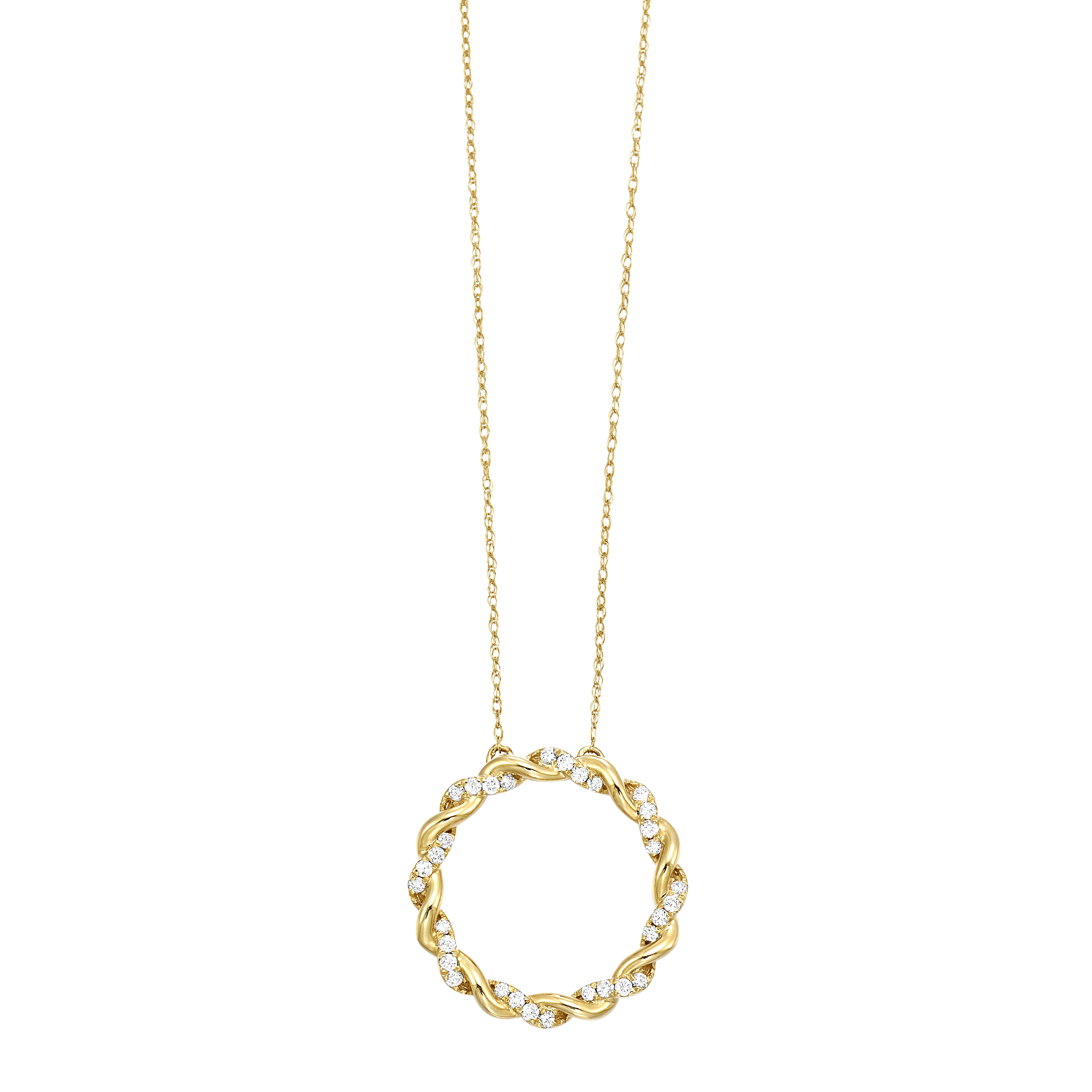 This gold and diamond fashion pendant is made up of a row of diamonds twisted around a row of high polish 10K yellow gold.