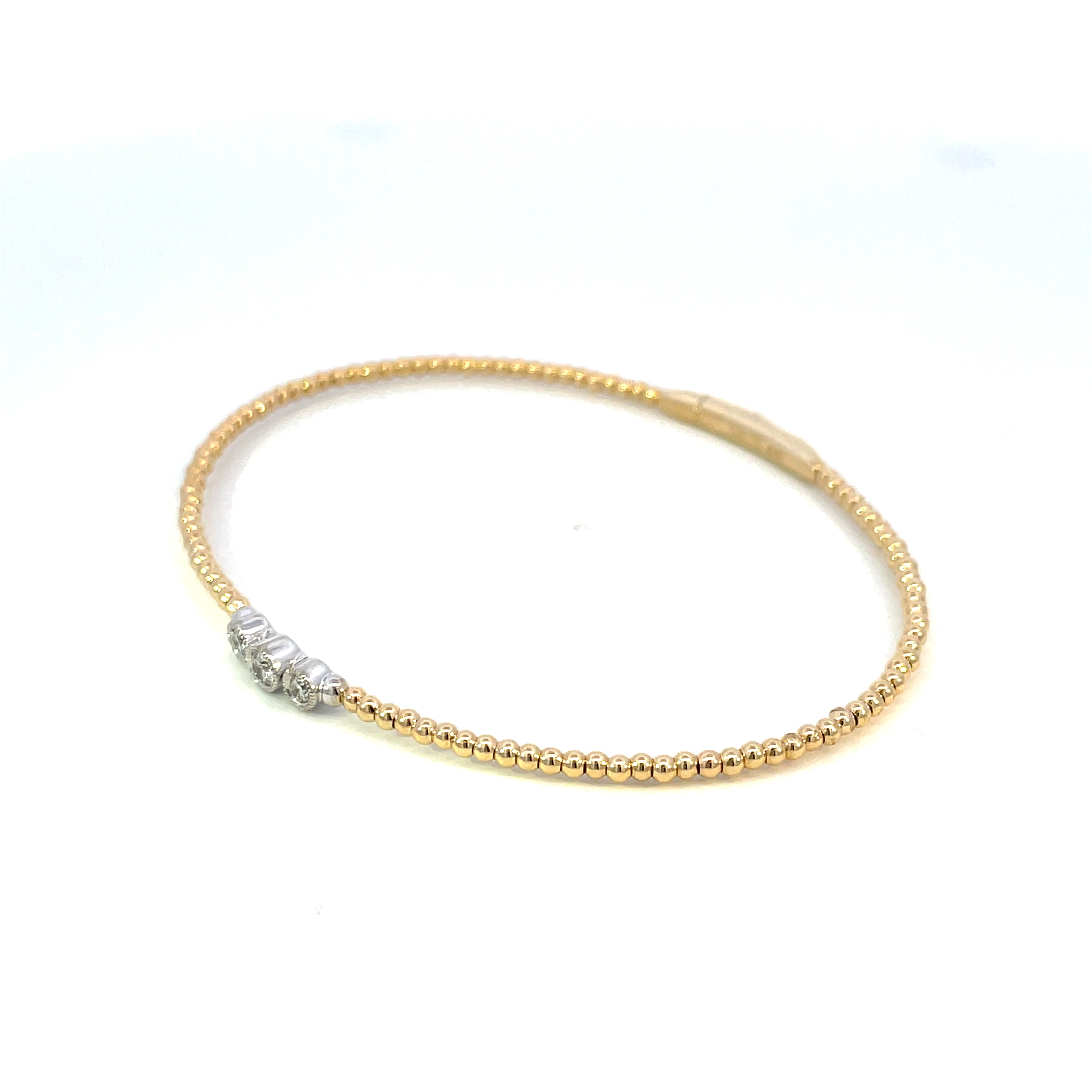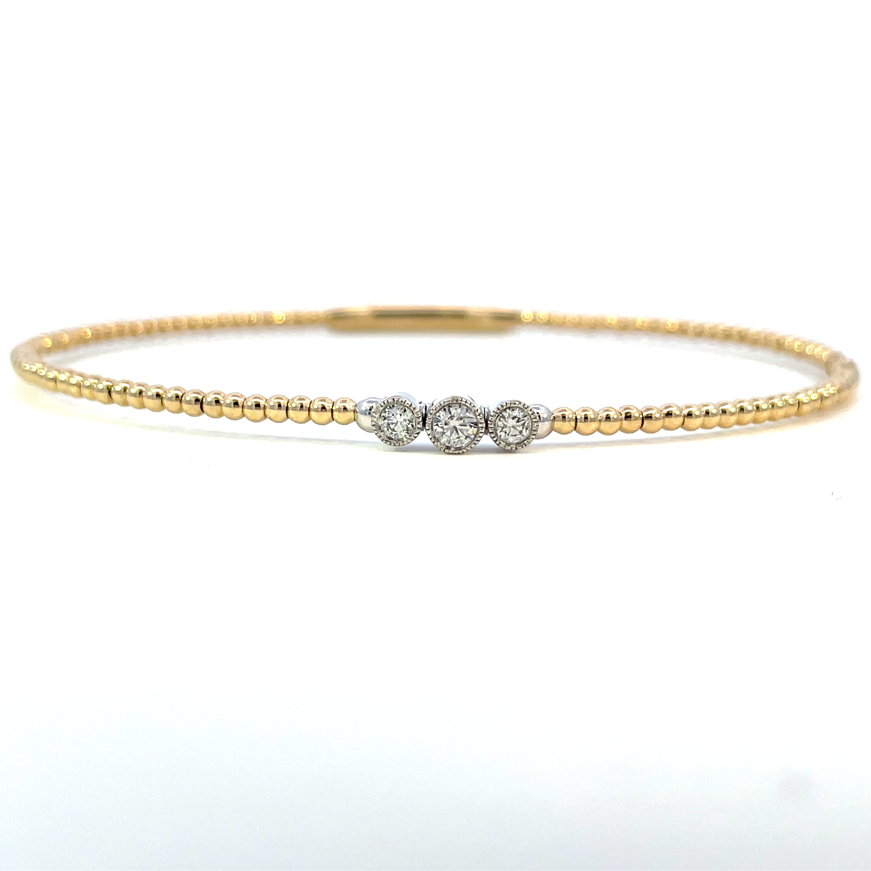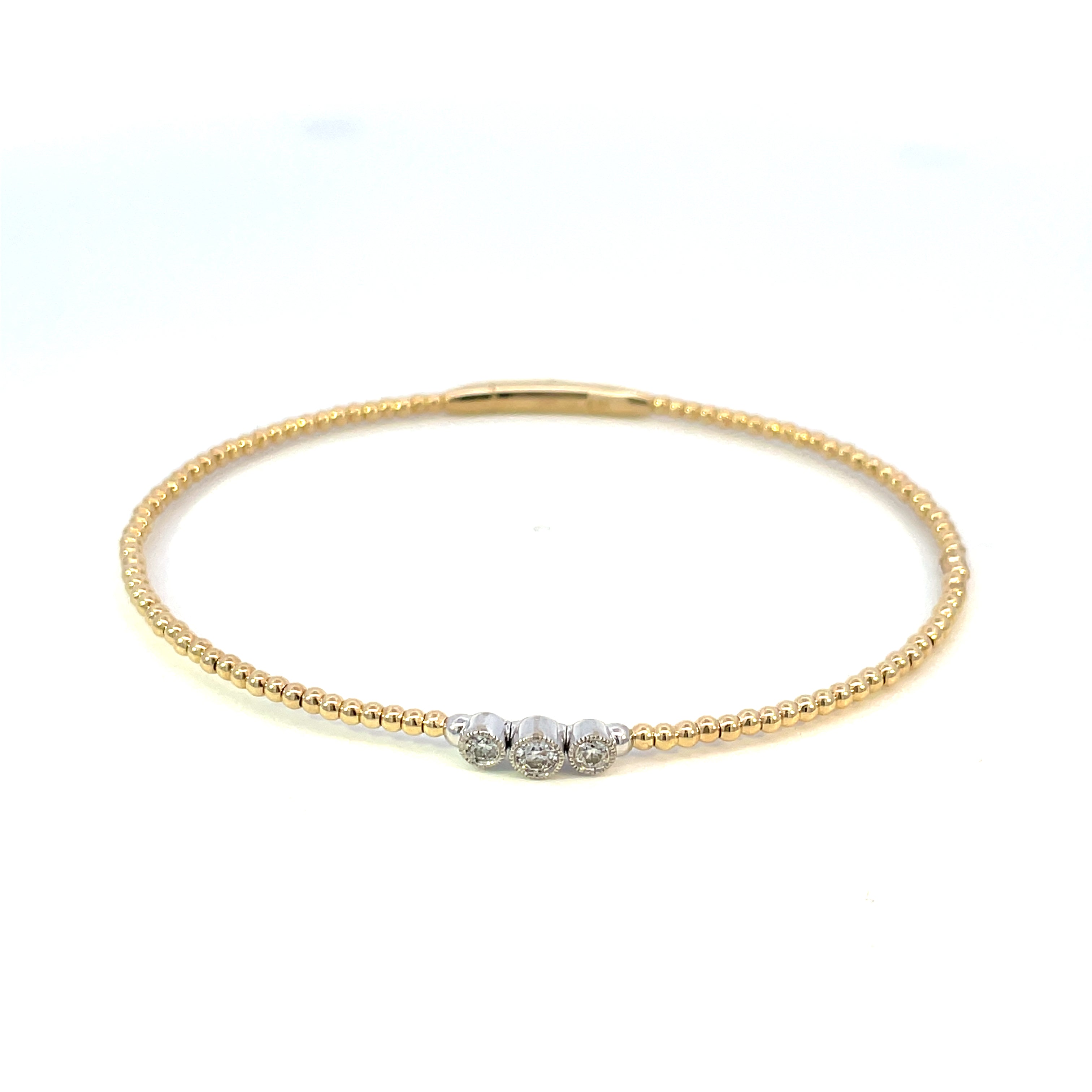 Expertly crafted with 14K yellow gold, this Flexi-Bangle Bracelet features 3 dazzling round diamonds, each set in a white gold bezel. With a total weight of .17 carats, this beaded bangle adds a touch of elegance and sparkle to any outfit. Perfect for any occasion, this versatile bracelet is a must-have for your jewelry collection.