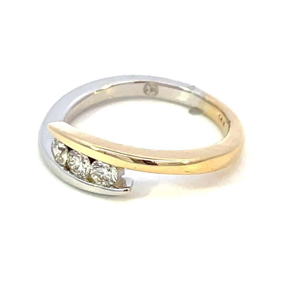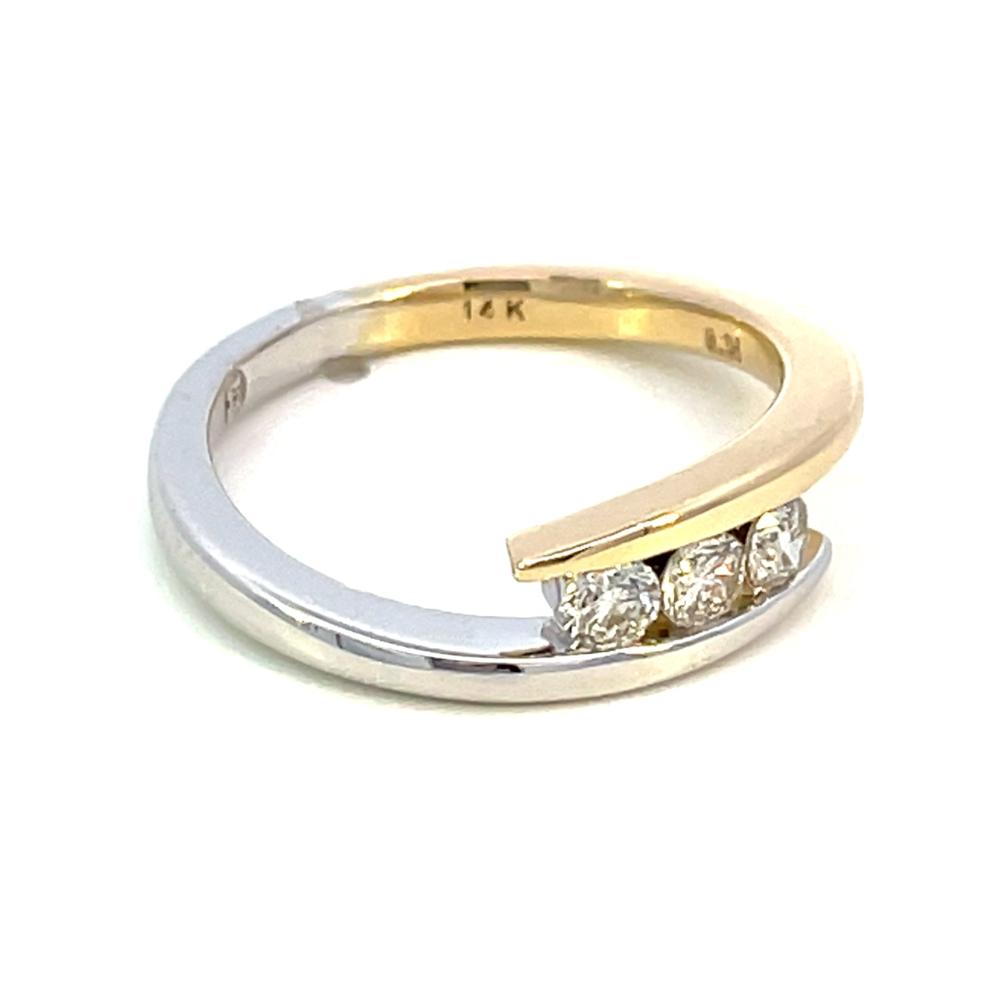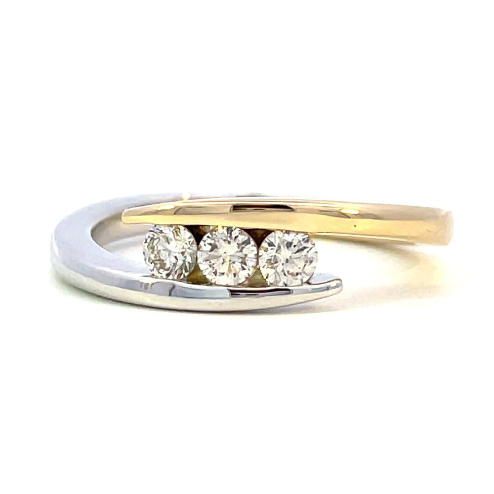 Enhance your style with this elegant 14K two-toned three-stone bypass ring. Crafted with 14K white and yellow gold and adorned with three sparkling diamonds totaling .34 carats, this ring exudes luxury and sophistication. Perfect for any occasion, this ring is sure to make a statement and elevate your overall look.