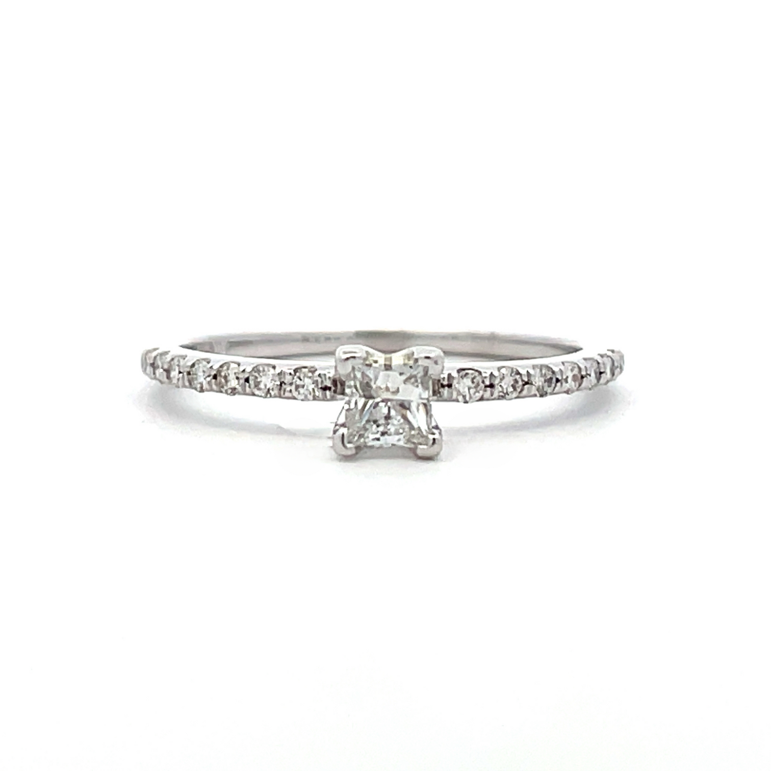 There's nothing quite like a timeless and classic design. This beautiful engagement ring has the perfect amount of sparkle. Features a .26 carat princess cut center stone and .14 carat total weight on the shared prong band for a total of. 40 carat total weight.