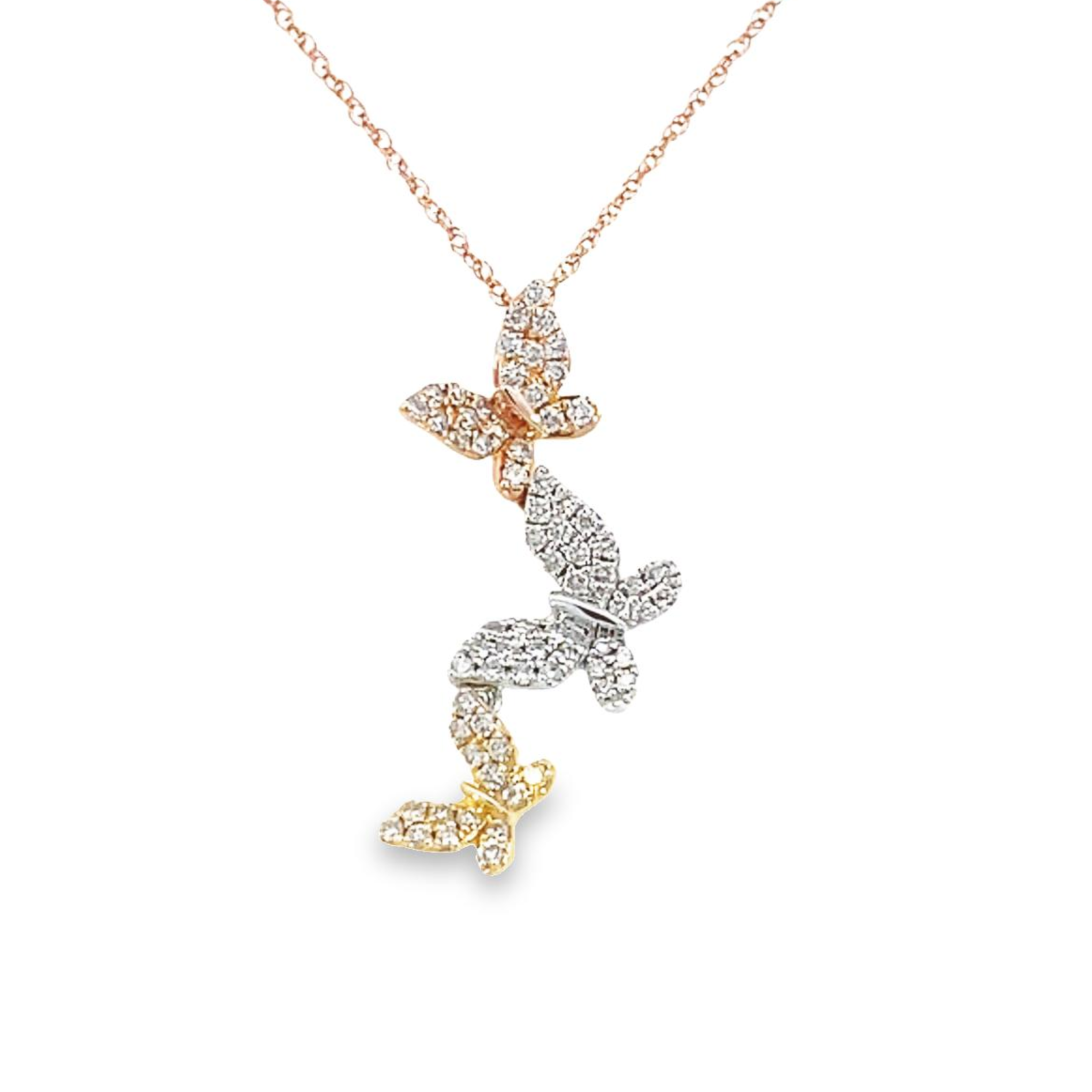 This necklace gives us butterflies! 14K rose, white and yellow gold come together to create a stunning three-tiered pendant. Each butterfly is connected to the next by a joint that gives the pendant movement and allows for the 1/3 carat total weight of diamonds to catch the light and sparkle from every angle. Set on an 18 inch 14KR chain with a lobster clasp.
