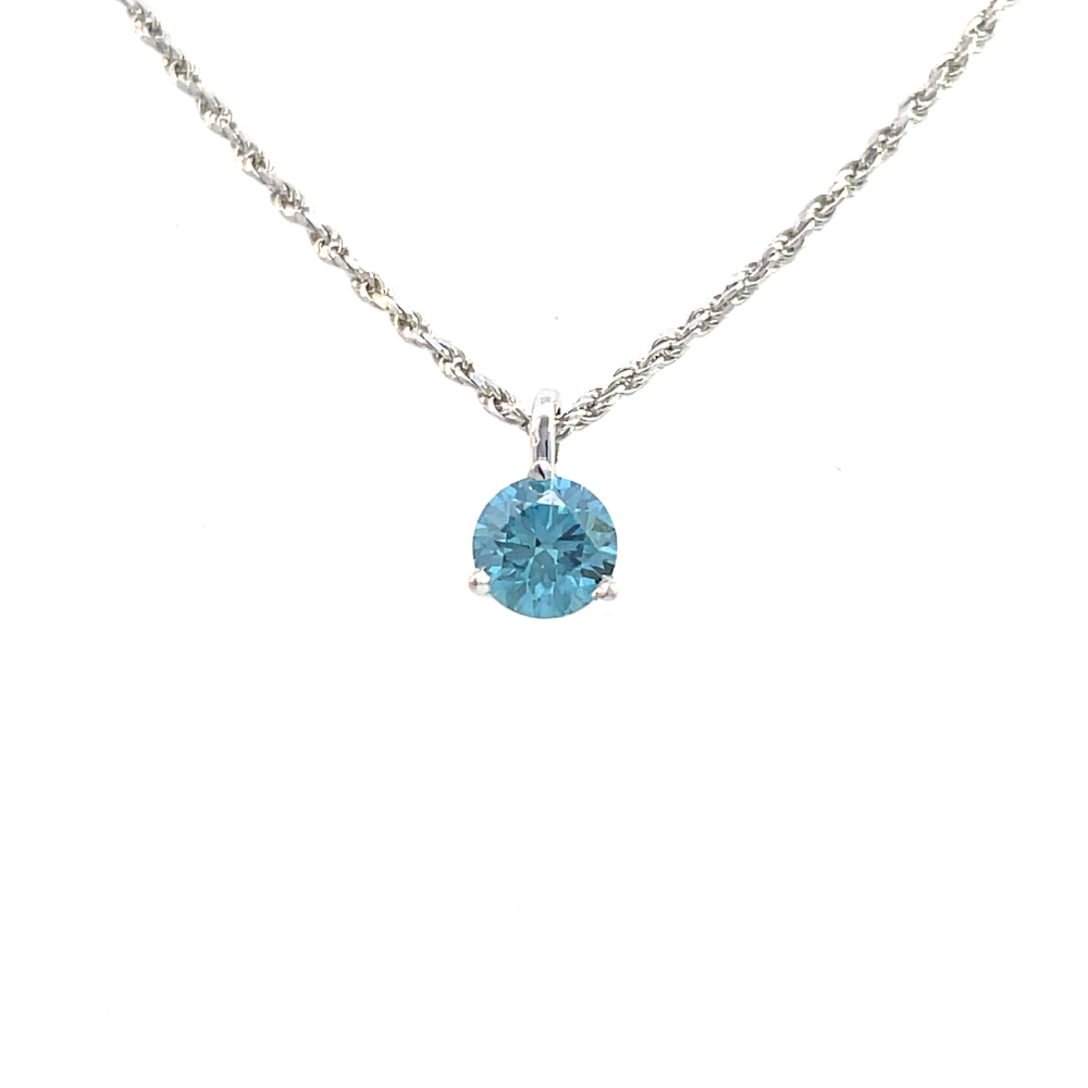 Discover elegance and sustainability with Flourish by Fernbaugh's Blue Diamond Pendant. Crafted from 14 karat white gold, this pendant features a stunning 0.44 carat round brilliant vivid blue LAB GROWN diamond set in a 14K white gold martini pendant. Paired with an 18" twisted rope chain for a timeless look.